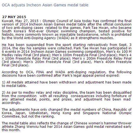 ???? 27?, ?????????(OCA) ?????? ?? ???? ???? 2014? ????????? ??? ??? 1?? ??? 5?? ???? ????? ??? ????? ???? ???. ?? ?????? ??? ???? ?????? ??? 2?? ????.